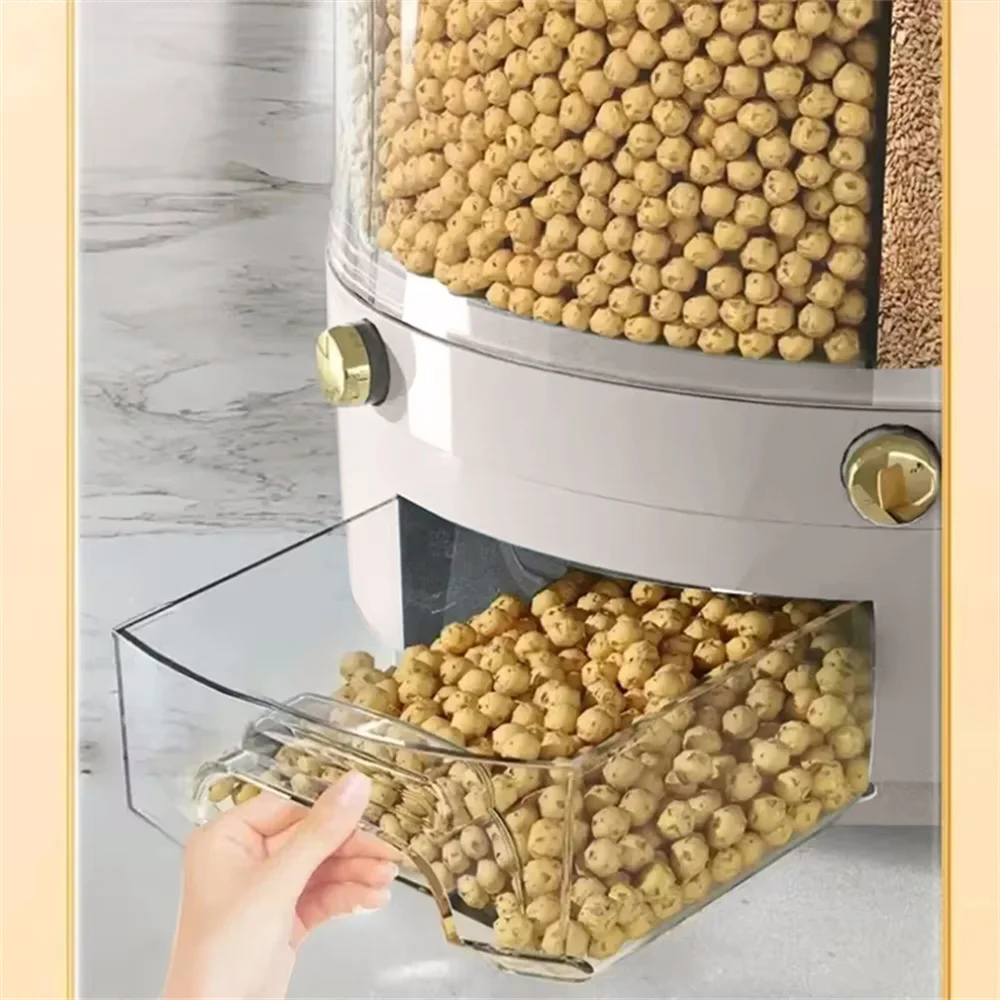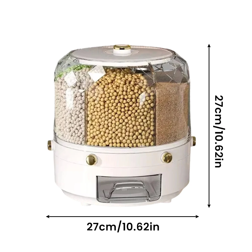 Ce modèle pratique et moderne vous permet de garder vos provisions à l’abri de l’humidité, de la poussière et des insectes. Cette boîte de rangement rotative anti-humidité à compartiments étanches est équipée de 6 compartiments indépendants, parfaits pour stocker riz, céréales, lentilles, thé, café ou croquettes.