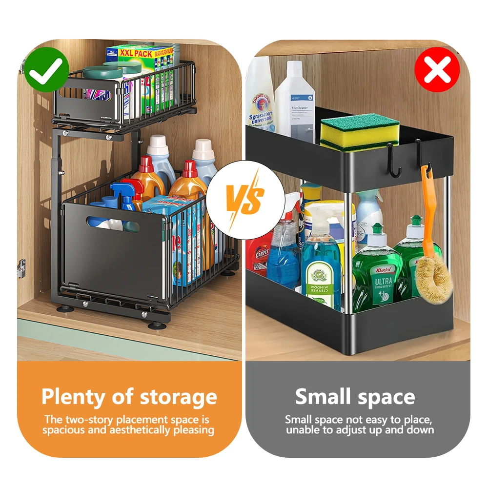 Utilisation polyvalente :L’organisateur sous l’évier est parfait pour contenir et organiser des objets en vrac et les garder propres.C’est un excellent organisateur d’armoire coulissant pour les armoires, la cuisine, le garde-manger, la salle de bain, le salon, le bureau et plus encore.